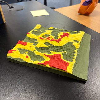 3D Print Topology: We produced a physical model of the dunes, 3D printed in three distinct colours to represent specific topographic elevations.